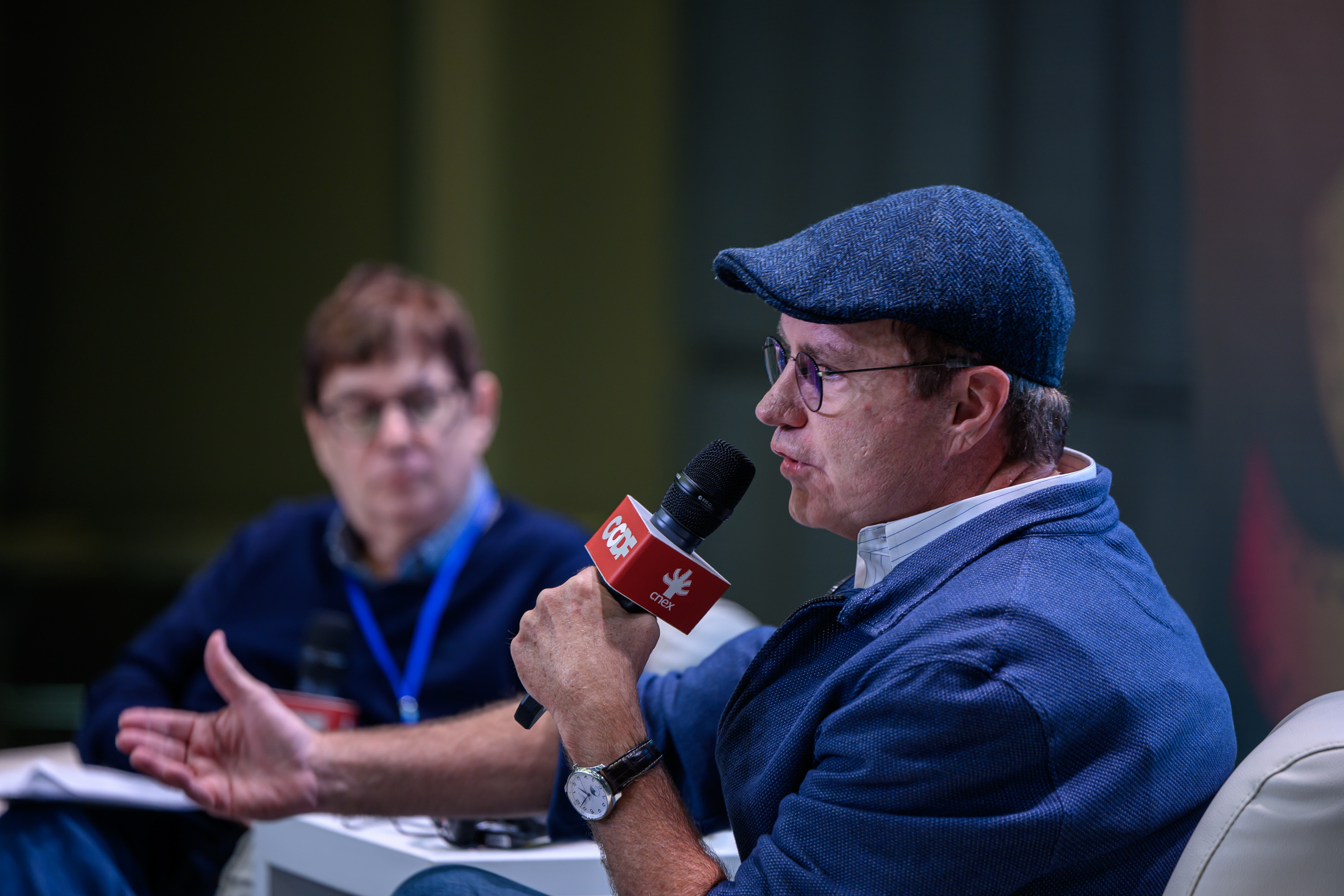 當代紀錄片導演 Tom Jennings 於 CCDF 國際紀錄片論壇發表主題演講,以「動盪時代的紀錄片趨勢」為題,分享他多年在國際市場的觀察與實務經驗。由世界科學與紀實節目製作人大會總監 Paul Lewis 主持的這場對談,以「Perfect Storm(完美風暴)」開場,象徵紀錄片產業正遭遇前所未有的挑戰——財務不穩、全球局勢動盪、AI 技術威脅、企業併購與預算削減同時席捲而來。Paul Lewis 指出,這場「風暴」不僅考驗創作者,也迫使整個產業重新思考自身的方向。